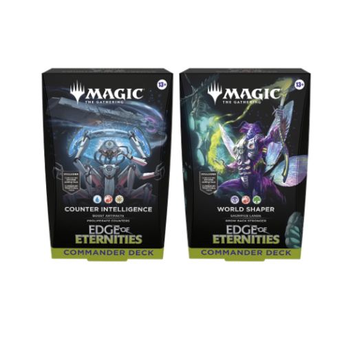 This bundle includes both of the 2 Edge of Eternities Commander Decks. Each includes 1 deck of 100 Magic cards (98 nonfoil cards and 2 Traditional Foil Borderless Legendary cards), a 2-card Collector Booster Sample Pack (contains 1 Traditional Foil or nonfoil alt-border card of rarity Rare or higher and 1 Traditional Foil Uncommon card), double-sided token cards (10 in Counter Intelligence and 6 in World Shaper), 1 deck box (can hold 100 sleeved cards), 1 strategy insert, and 1 reference card.