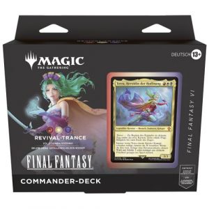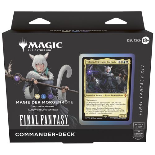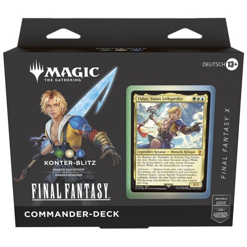 Die gesamte FINAL FANTASY Saga ist hier versammelt! Erkundet die Welten der sechzehn Hauptableger der beliebten RPG-Reihe FINAL FANTASY mit einem Commander-Deck , das vor allem aus Karten aus FINAL FANTASY VI, FINAL FANTASY VII, FINAL FANTASY X oder FINAL FANTASY XIV besteht. Wirkt mächtige Zaubersprüche, ruft klassische Beschwörungen herbei und besucht eure Lieblingsorte auf dem Rücken eines Chocobos. Es gibt unzählige Elemente aus den Spielen, aus denen ihr eure eigene Geschichte weben könnt.